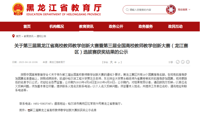 据悉,按照中国高等教育学会《关于举办第三届全国高校教师教学创新大赛的通知》要求,黑龙江赛区共有14个国赛推荐名额,国赛预计将在2023年5月启动。
