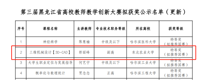 2023年4月16日第三届黑龙江省高校教师教学创新大赛暨第三届全国高校教师教学创新大赛(龙江赛区)选拔赛落下帷幕,我院教师郭丽峰从251名参赛选中脱颖而出,斩获副高组特等奖,同时拟推荐参加第三届全国高校教师教学创新大赛。