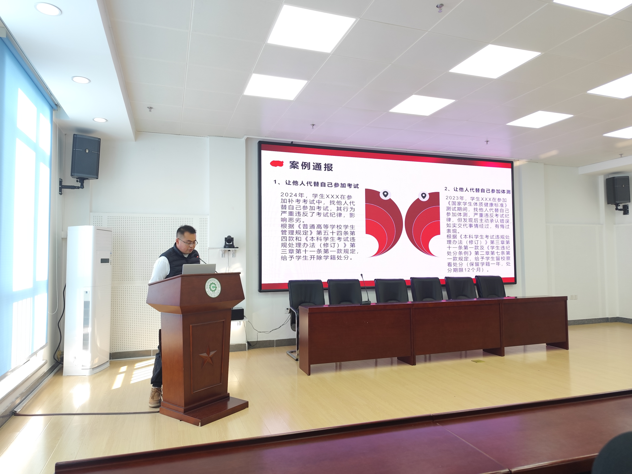 随着期末考试季的来临,为树立2007so太阳集团学生良好的考风考纪,塑造良好品德,真实反映学业水平,2007so太阳集团2024级新生辅导员李明键、张旌于1119日至22日一周的时间,分三个主题:“太阳集团2007本科学生考试违规处理办法学习”、“学生考试违纪案例通报警示”、“诚信考试承诺书签订”按班级分批次共计开展7次主题教育班会,要求全体学生严格遵守考场要求,做到诚信考试,不作弊、不抄袭,用自己的真实水平去迎接考试。