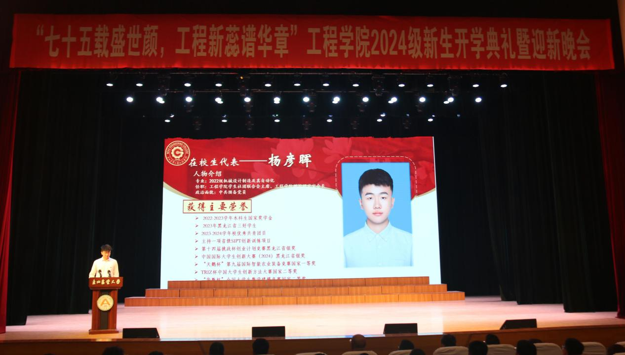博士生导师、教授公维佳代表全体教师发言,她建议2024级新同学们虚心学习、潜心科研,敢于走出舒适圈,自信而坚定去实现人生梦想。高考成绩613分的本科新生代表机化2481班许博雅作分享了她对农业机械的兴趣与喜爱,并且对未来四年大学生活的无限期待。研究生新生代表博2401班徐福东发言中号召同学们要打牢“基本功”,拓展“知识面”,锻造“硬脊梁”“铁肩膀”“真本事”,为全面建设社会主义现代化强国贡献自己的青春力量。在校生代表机化2206班杨彦晖同学在发言中首先表达了对学院的感谢,随后以自身的成长经历鼓励新同学们砥砺前行,创造属于自己辉煌。