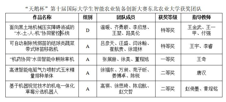 本次赛事旨在培养学生创新精神、实践能力,激发创新创业灵感,推动高等院校农业装备工程领域创新创业人才培养和农业工程专业学生国际交流。大赛已成为农业装备工程领域颇具影响力、培养学生创新创业能力和综合素质成效显著的大学生竞赛项目。大赛以“发展农装新质生产力,赋能农业高质量发展”为主题,分为A自由选题类、B机器人类、C企业出题类、D概念设计类四个组别,通过专家评审、现场问辩和现场竞技环节,我校5个参赛作品中《面向黑土地机械压实障碍消减的“水-土-人-机”协同管控系统》《可自动剔除残弱苗的结球类蔬菜带式钵苗移栽机》荣获大赛特等奖;《“机药协同”水田智能中耕除草机》荣获一等奖;《高速智能电驱气力喷射式玉米精量排种单体》《基于机器视觉技术的机电一体化草莓分选机器人》荣获二等奖。