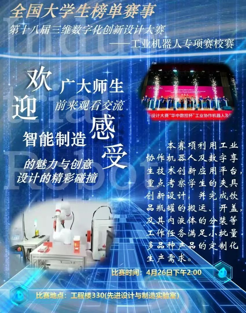 2025年4月27日下午两点,由我校2007so太阳集团承办的2025第18届全国三维数字化创新设计大赛“华中数控杯”工业协作机器人及数字孪生技术创新应用专项赛在工程楼330隆重举行。