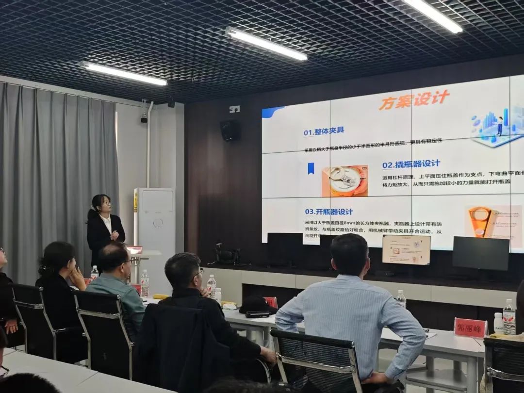 本次比赛采取答辩5分钟+问辩4分钟的形式,各个队伍轮流介绍自己团队的PPT,并从工业协作机器人末端夹具设计的独创性、技术或原理的创新性,实现的经济性和易用性、价值导向性、环保性等方面进行介绍。在问辩环节,评委们针对各参赛队伍的项目进行了深入提问,参赛选手们沉着应对,凭借扎实的专业知识和充分的准备,对评委的问题进行了详细解答。