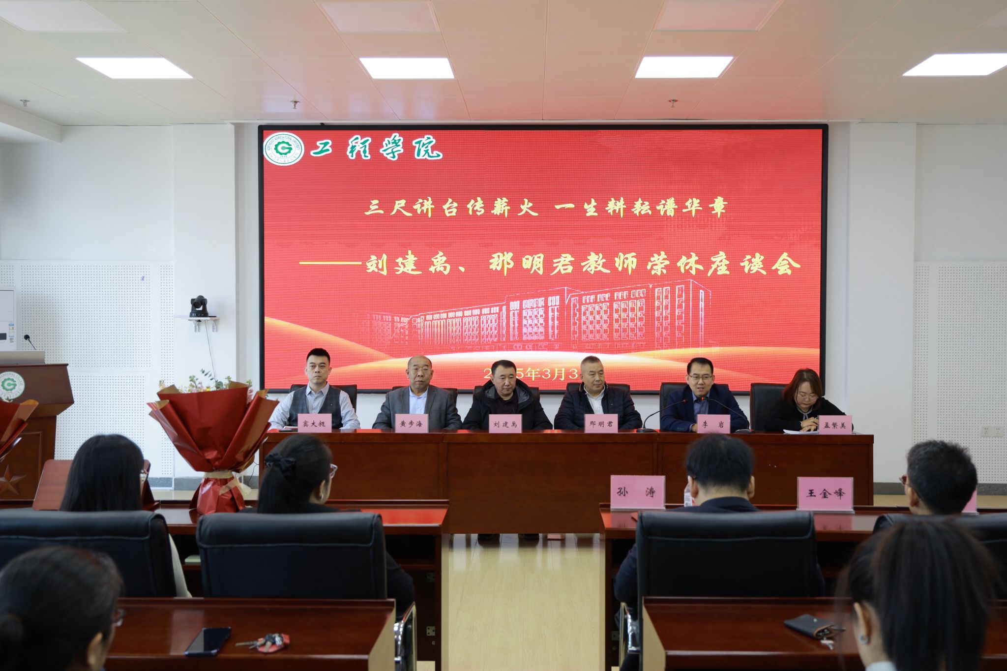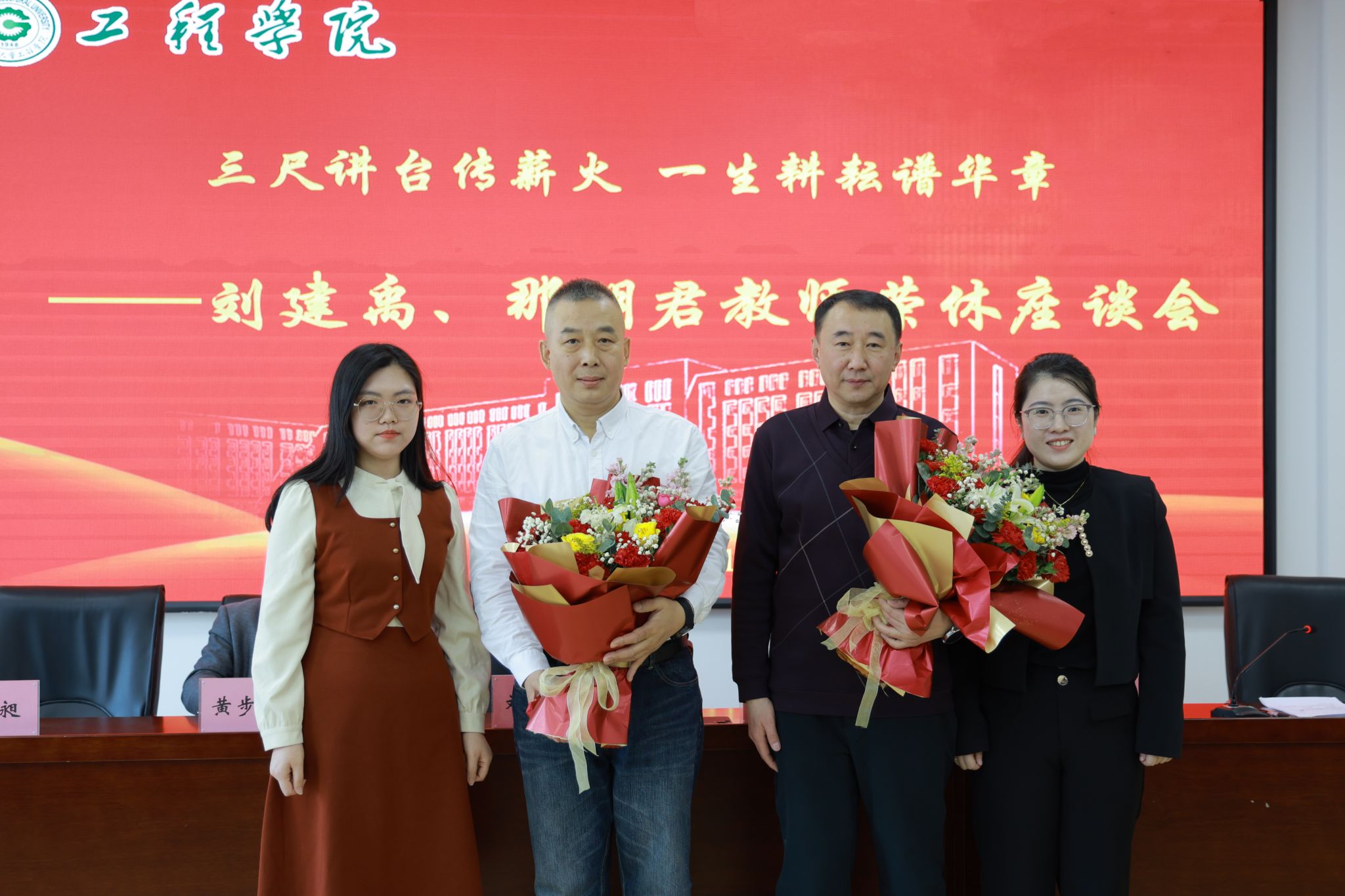 师道传承,致敬育人初心院长李岩在致辞中深情回顾了刘建禹、那明君两位教师深耕教坛四十余载的卓越贡献。他指出,两位教师三寸粉笔写春秋的坚守夯实农业工程学科根基,用三尺讲台育桃李的情怀培养了千余名行业精英,其育人风范将成为推动学院发展的精神财富。青年教师代表张盛明、刘爽张影微、尚家杰通过鲜活的工作事例,生动讲述了两位前辈在教学科研、师德传承中的示范引领,表示将继承发扬老一辈教师精神,勇担育人使命。
