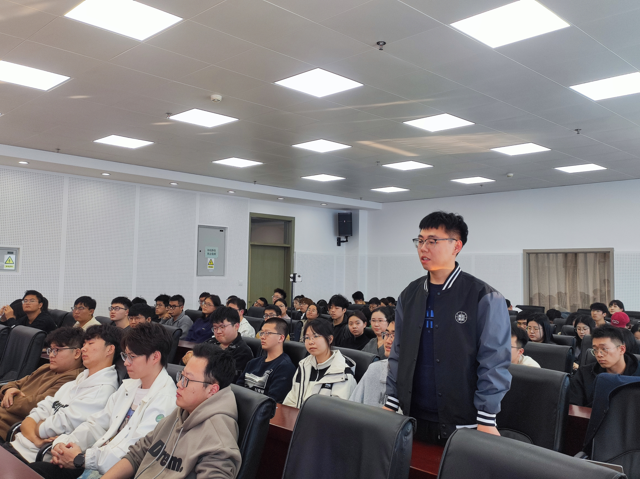 在互动环节中,同学们积极提出问题,贾富国教授耐心细致地为同学们答疑解惑,从科研到生活,从学术到理想,贾富国教授以自己为例,鼓励同学们潜心学习、打牢基础、厚积薄发,给在场的同学们提供了关于未来科研道路的新理解与新认识。