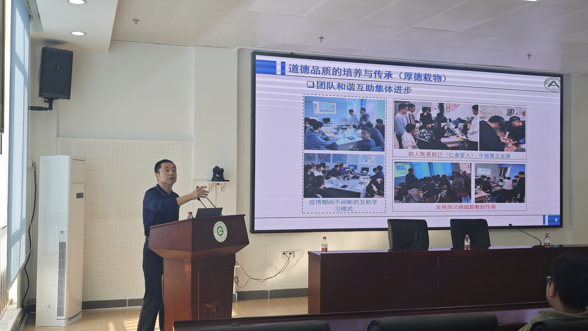 贾富国教授以《驾驭时代的风帆》为主题,从时代的呼唤与困境、理解父母的苦和难、道德品质的培养与传承、科研的切入点、科研实践与方法和实验室生活文化氛围六个方面进行了分享。贾富国教授指出,高素质人才是推动国家前行的关键力量。贾富国教授希望与会的各位同学,在踏入科研领域的第一步,要铭记父母的辛勤与不易,将安身立命、孝养父母、报效祖国作为指引人生的明灯。同时,贾富国教授高度重视道德品质的培养与传承,他反复强调“厚德载物”的重要性,勉励与会同学不仅要追求知识的广度与深度,更要注重提升品德修养,努力成为对社会有贡献的人。