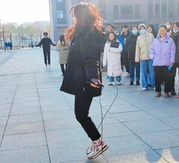 激情与紧张同在,友谊与竞争共存,随着裁判员的一声哨响,跳大绳比赛正式开始。大家神采奕奕、斗志昂扬,比赛中分工协作、互帮互助。摇绳队员奋力甩动手中的跳绳,跳绳在他们的手中上下起伏、左右飞舞;跳绳队员整齐划一、进退有法,有的是双脚离地轻轻跃起、有的是两脚一前一后轻轻迈过,连贯有序,比赛场面十分热烈。小绳比赛中,各支队伍全力以赴、精彩纷呈,各位选手轮番竞速,你追我赶,实力尽展。跳绳比赛既需要团队协作又需要个人比拼,参赛队员承受着心理和身体的双重考验,这更激发了他们努力拼搏、永不服输的运动精神。最后在加油声、呐喊声、欢笑声中,硕2103班勇夺第一!