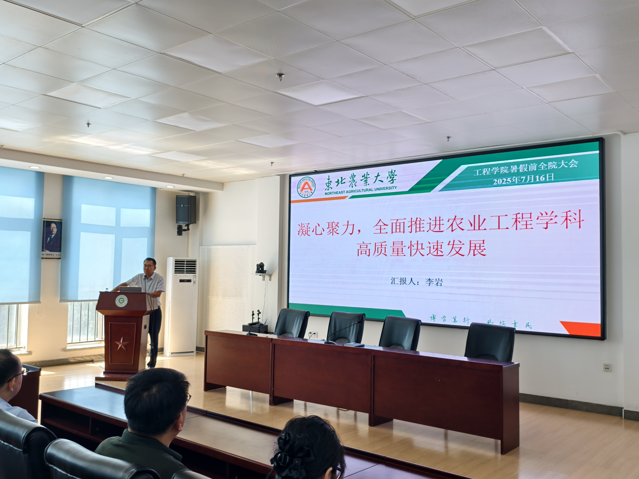 接下来,为让全体教职工深入了解我校当前农业工程学科的建设与发展情况,李岩做了“凝心聚力,全面推进农业工程学科高质量快速发展”的报告。从农业工程学科基本情况、近年来取得的建设成效、与其他高校学科对比等方面进行了性详细的介绍与对比分析,并对今后的建设提出了思考与具体要求。