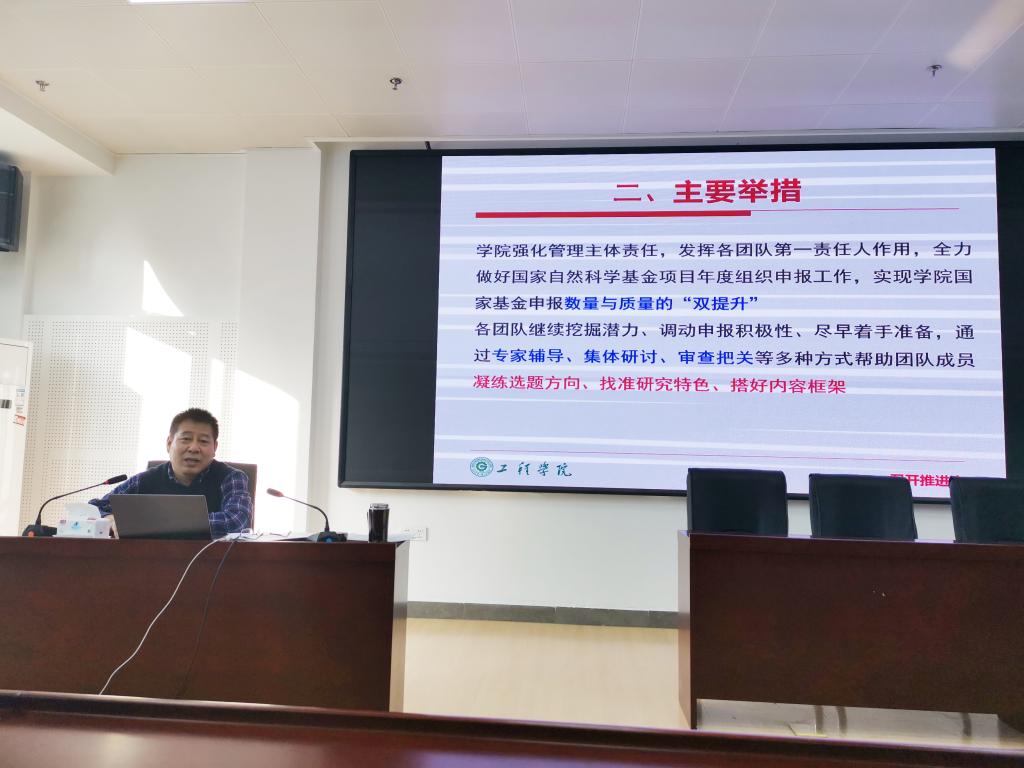 王金武院长首先对学院2020年基金申报立项情况进行了总结,对所获基金的学科分布、类别、人员、资助率等进行了对比分析。在此基础上,针对我院2021年国自然预申报情况:申报数量、申报学部、申报题目做了详尽的分析。接下来,王院长根据我院具体情况,提出了推进学院基金申报工作的主要举措,强调学院要强化管理主体责任,发挥各团队第一责任人作用,全力做好国家自然科学基金项目年度组织申报工作,实现学院国家基金申报数量与质量的“双提升”,各团队要继续挖掘潜力、调动申报积极性、尽早着手准备,通过专家辅导、集体研讨、审查把关等多种方式帮助团队成员凝练选题方向、找准研究特色、搭好内容框架。最后,对下一步工作进行了安排部署,并鼓励拟申报教师认真准备材料,要做到认真筹划、精心设计、严谨求证、不断完善、精益求精。