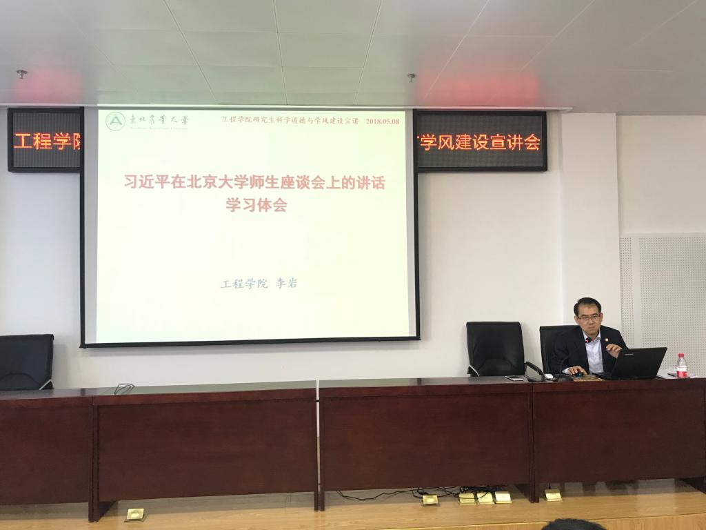 副院长李岩向全体参会学生介绍了自己关于习近平在北京大学师生座谈会上的讲话学习体会,认为在十九大之后第一个五四青年节来临之际,习总书记来到北京大学与师生座谈,具有重要和深远的意义。讲话精神为新时代高校要培养什么样的人才,如何培养人才指明了方向,给出了要求。为青年人朝着什么方向发展,如何发展,提出了殷切的希望。习总书记在讲话中指出:“当代青年是同新时代共同前进的一代。”、“广大青年既拥有广阔发展空间,也承载着伟大时代使命。青年是国家的希望、民族的未来。我衷心希望每一个青年都成为社会主义建设者和接班人,不辱时代使命,不负人民期望。对广大青年来说,这是最大的人生际遇,也是最大的人生考验。”李岩表示,“广大青年生逢其时,也重任在肩。广大青年要成为实现中华民族伟大复兴的生力军,肩负起国家和民族的希望。高校只有抓住培养社会主义建设者和接班人这个根本任务,才能办出、办好中国特色世界一流大学。”并希望研究生们在会后要积极开展学习习近平总书记重要讲话的活动,把精神领悟透,并切实贯彻到自己的学习生活中,学以致用,学有所得。