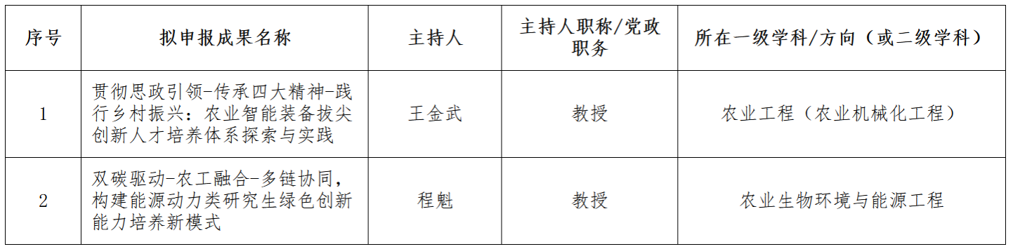 学校为进一步深化研究生教育教学改革,全面总结近年来我校研究生教育教学建设取得的经验和成果,推动我校研究生教育高质量发展,学校决定开展2025年校级研究生教学成果奖评选工作,结合学校关于申报名额及限制条件等相关规定https://graduate.neau.edu.cn/info/1149/4152.htm,我院积极组织相关申报工作。经教师个人申报、学院组织专家评审等环节,拟推荐以下项目参与2025年度太阳集团2007研究生教学成果奖申报,现将推荐项目予以公示: