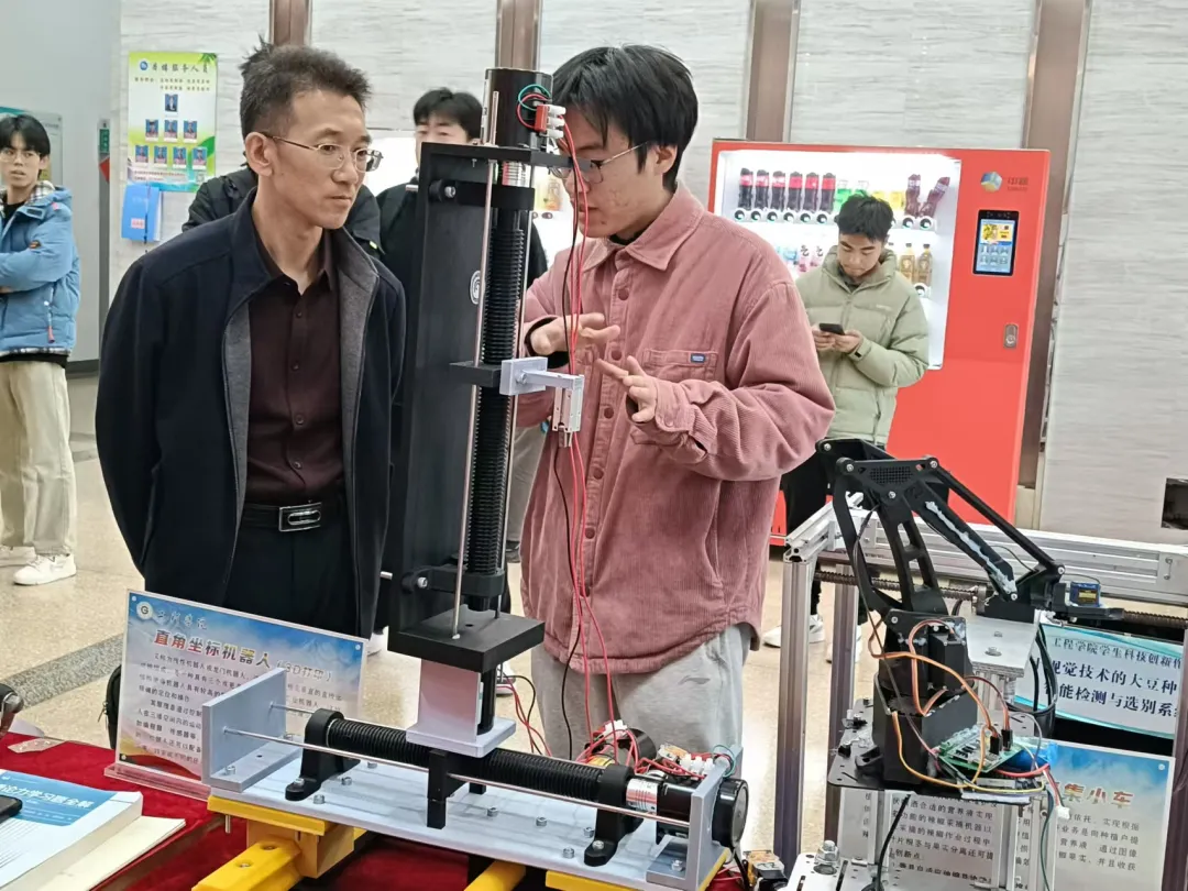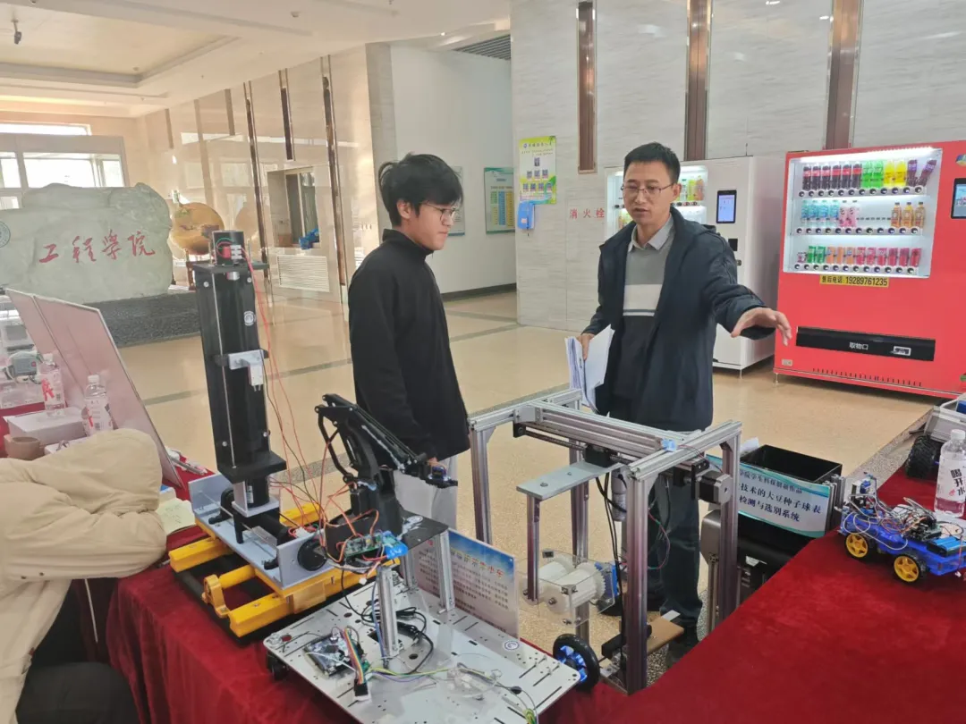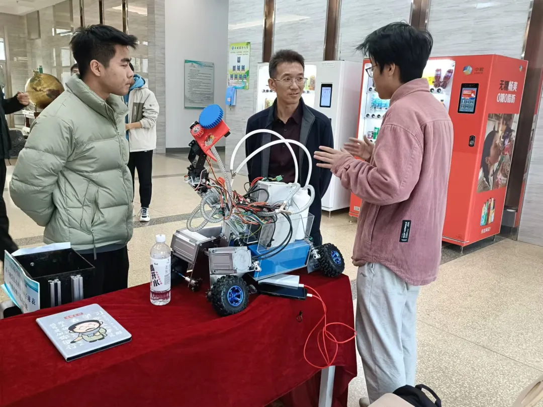 仪式现场设有科技创新协会展板展示成果,领导老师参观路演展位。仪式结束后,第十三期“工道论坛”成功举行,测控研究室指导教师王宇结合自身指导学生科创的经验,为全体学生分享了为何要参与科创及如何参与科创。