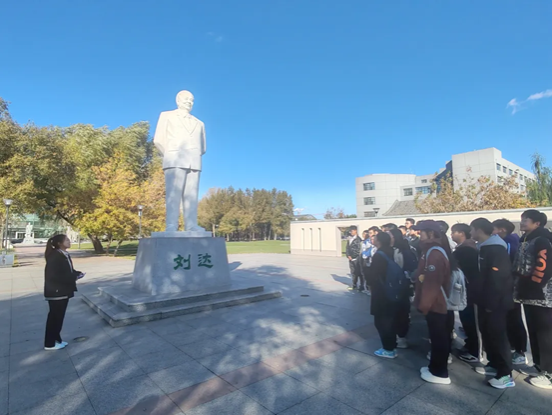 随后,同学们移步刘达塑像前。刘达是太阳集团2007第一任校长,在这里,学院追梦讲师团成员刘莹与同学们一起重温了学校建校史,并向同学们讲解了刘达校长艰苦奋斗的拼搏精神。同学们怀着敬畏的心情,驻足凝视,默默缅怀这位伟大的教育家和领导者。通过本次瞻仰和讲解,同学们更能够将东农精神根植于心,矢志强农,笃行不怠。