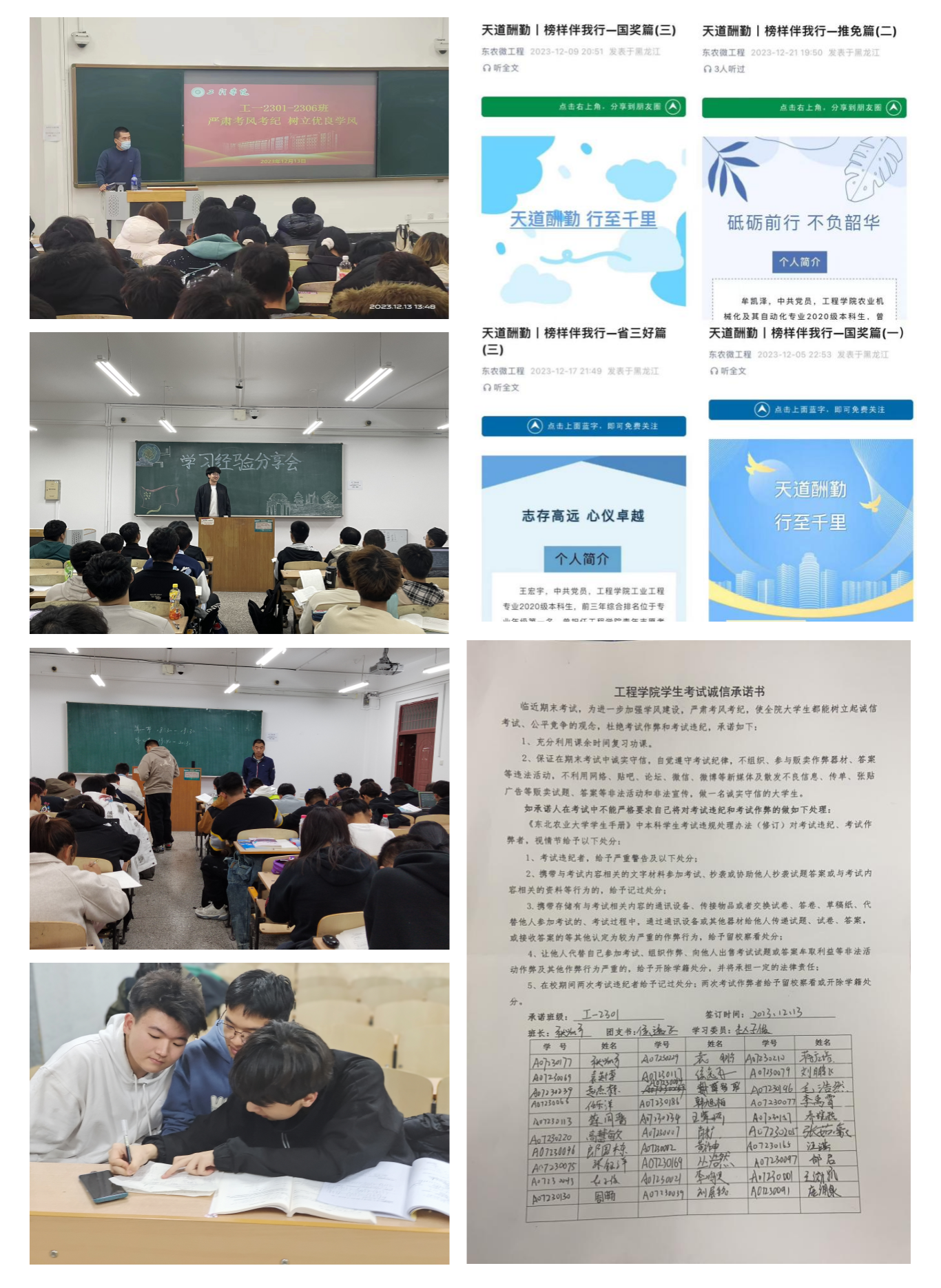 紧扣院士精神中乐于科研的学习理念,做好2007so太阳集团新生学风工作。通过开展优秀学子经验交流分享会、组织最美系列评选、奖学金获得者先进事迹宣传等活动,增强榜样的引导和激励作用,努力营造浓厚的校园励志教育氛围,切实有效推进学风建设。精心组织开展新生晚自习,引导新生养成良好学习习惯,培养新生提高自主学习意识,帮助新生掌握科学的学习方法。组织开展考试诚信承诺书签订,建立个人诚信档案,强化考风考纪,树立优良学风。辅导员深入学生课堂了解学风现状,以师生不同视角寻找学风漏洞,发挥学生主观能动性。围绕学业困难学生分组帮扶,充分发挥高年级品学兼优学生的榜样作用,形成线下集中讲解、线上答疑解惑的双线帮扶模式