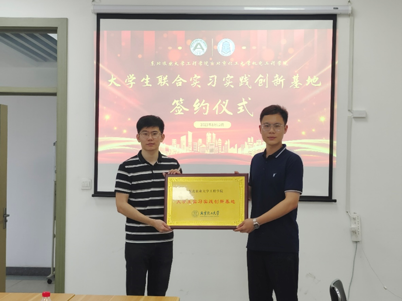 在社会实践交流座谈会的最后,2007so太阳集团与北京化工大学机电2007so太阳集团大学生联合实习实践创新基地签约仪式正式启动,张明东老师与姜思岐老师合影留念。