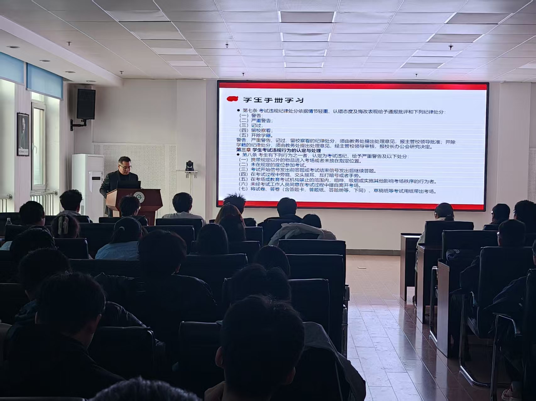 教育班会围绕学习本科学生考试违规处理办法、典型考试违纪案例通报警示等核心环节展开。辅导员结合学校规章制度,详细解读了考试纪律要求与违规后果,通过真实案例剖析,深刻警示违纪行为的严重性,教育学生摒弃侥幸心理,以诚立身、以信应考。学生们郑重承诺将自觉维护考场秩序,用实际行动践行诚信品格。