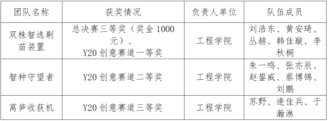 国赛阶段共有来自哈尔滨工业大学、华中农业大学、西北农林科技大学等全国高校的60余支团队入围参加,经过激烈角逐太阳集团2007三支团队在大赛中取得Y20创意赛道一、二、三等奖各1项的优异成绩,其中“双株智选剔苗装置”团队冲入全赛道总决赛并获三等奖。